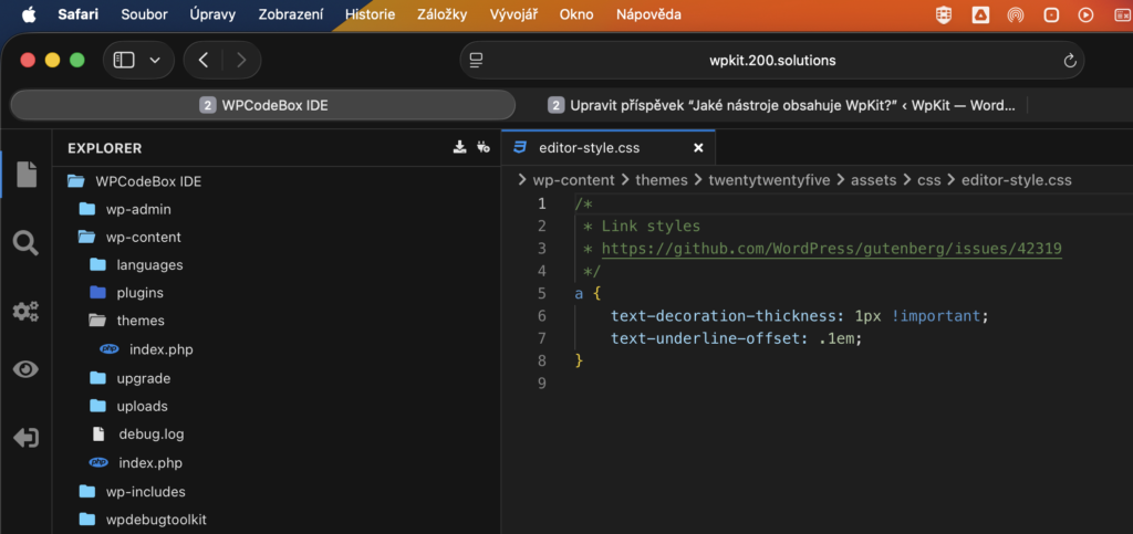 To nejlepší nakonec. Plugin WP Code Box IDE je téměř plnohodnotné Visual Studio Code přímo ve WordPressu. Máte k dispozici prohlížeč souborů, editor kódu a našeptávání přímo z Vašeho prohlížeče. Opět vše funguje nezávisle na zdraví instalace WordPressu, takže pokud se něco „podělá“, můžete skrze toto rozhraní web snadno opravit. Společně s WP Debug Toolkit Pro je toto opravdový pomocník při řešení jakýchkoliv problémů.